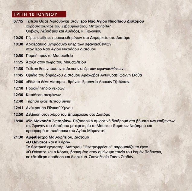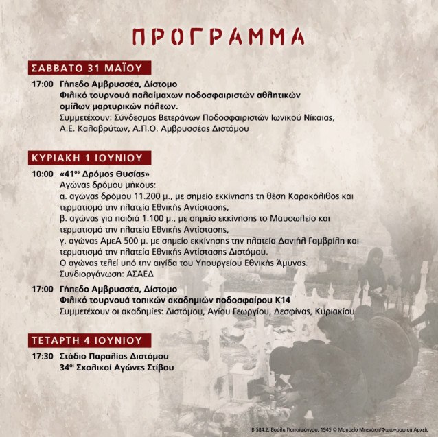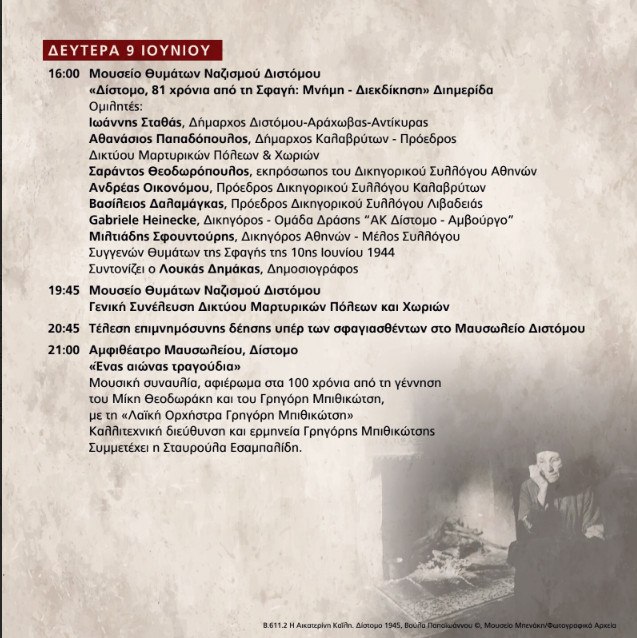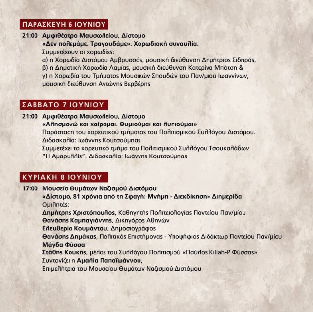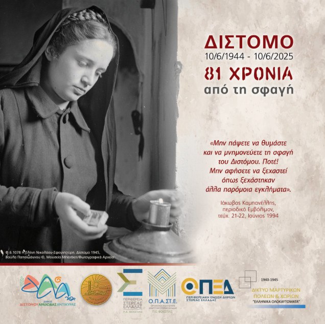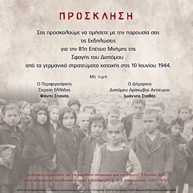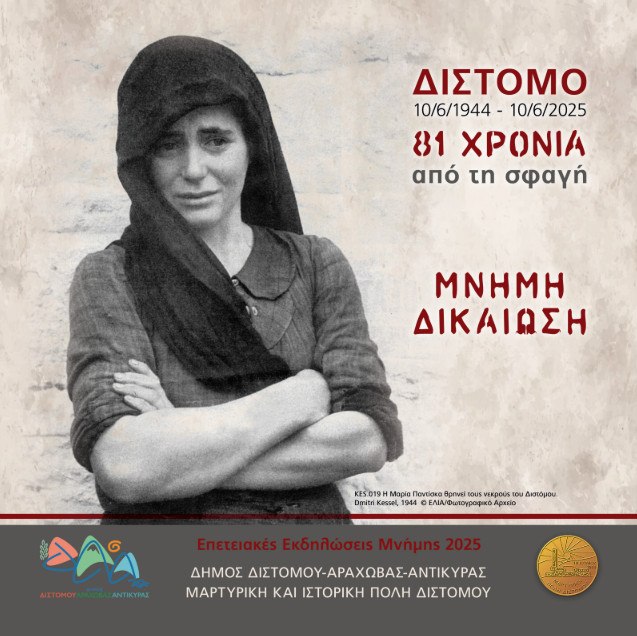 Ο Δήμος Διστόμου Αντικύρας με τη στήριξη της περιφέρειας Στερεάς Ελλάδας, έχει προγραμματίσει σειρά από εκδηλώσεις για την «81η Επέτειο Μνήμης της Σφαγής του Διστόμου», που θα ξεκινήσουν από το Σάββατο 31/5/2025 και θα ολοκληρωθούν την Τρίτη στις 10/6/2025.