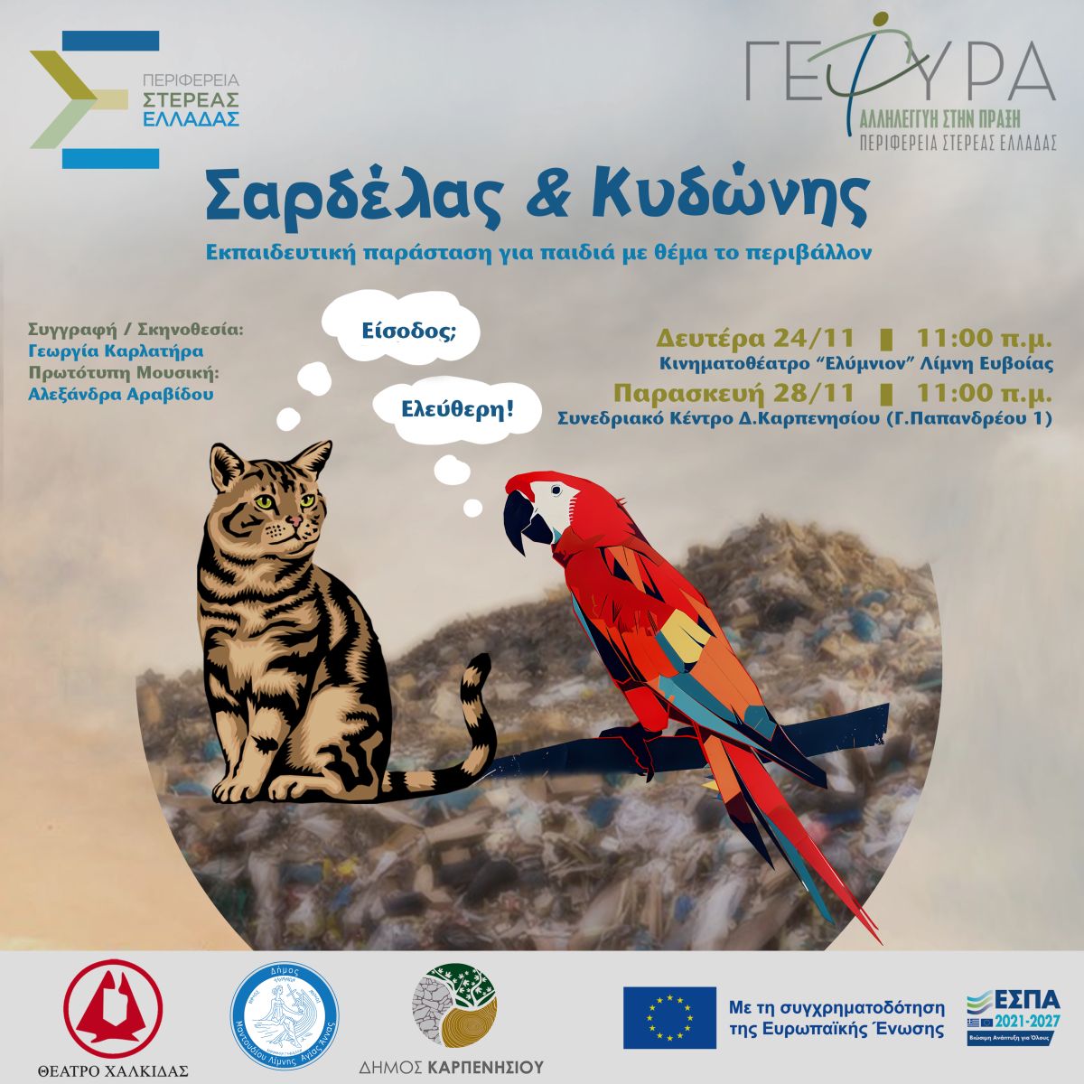 Η Περιφέρεια Στερεάς Ελλάδας σε συνεργασία με το Περιφερειακό Παρατηρητήριο Κοινωνικής Ένταξης – Δομή «Γέφυρα», και με αφορμή την Παγκόσμια Ημέρα Θεάτρου στην Εκπαίδευση (27 Νοεμβρίου), παρουσιάζουν την πρωτότυπη εκπαιδευτική θεατρική παράσταση “Σαρδέλας & Κυδώνης”.