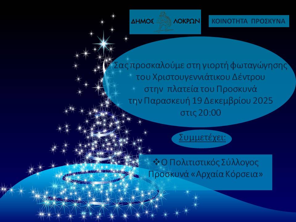 Ο δήμος Λοκρών και συγκεκριμένα η κοινότητα Προσκυνά, σας προσκαλούν στη φωταγώγηση του χριστουγεννιάτικου δέντρου της που θα γίνει την Παρασκευή 19 Δεκεμβρίου στις 8:00 το βράδυ στην πλατεία.