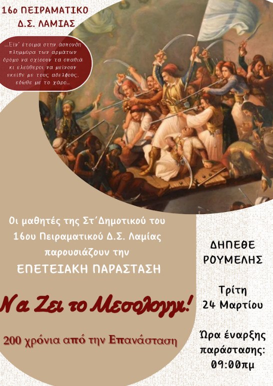 Οι μαθητές της ΣΤ΄ τάξης του 16ου Πειραματικού Δημοτικού Σχολείου Λαμίας παρουσιάζουν την επετειακή θεατρική παράσταση «Να Ζει το Μεσολόγγι!», τιμώντας τη συμπλήρωση 200 χρόνων από την Έξοδο του Μεσολογγίου, ένα από τα σημαντικότερα και πιο συγκλονιστικά γεγονότα της Ελληνικής Επανάστασης.