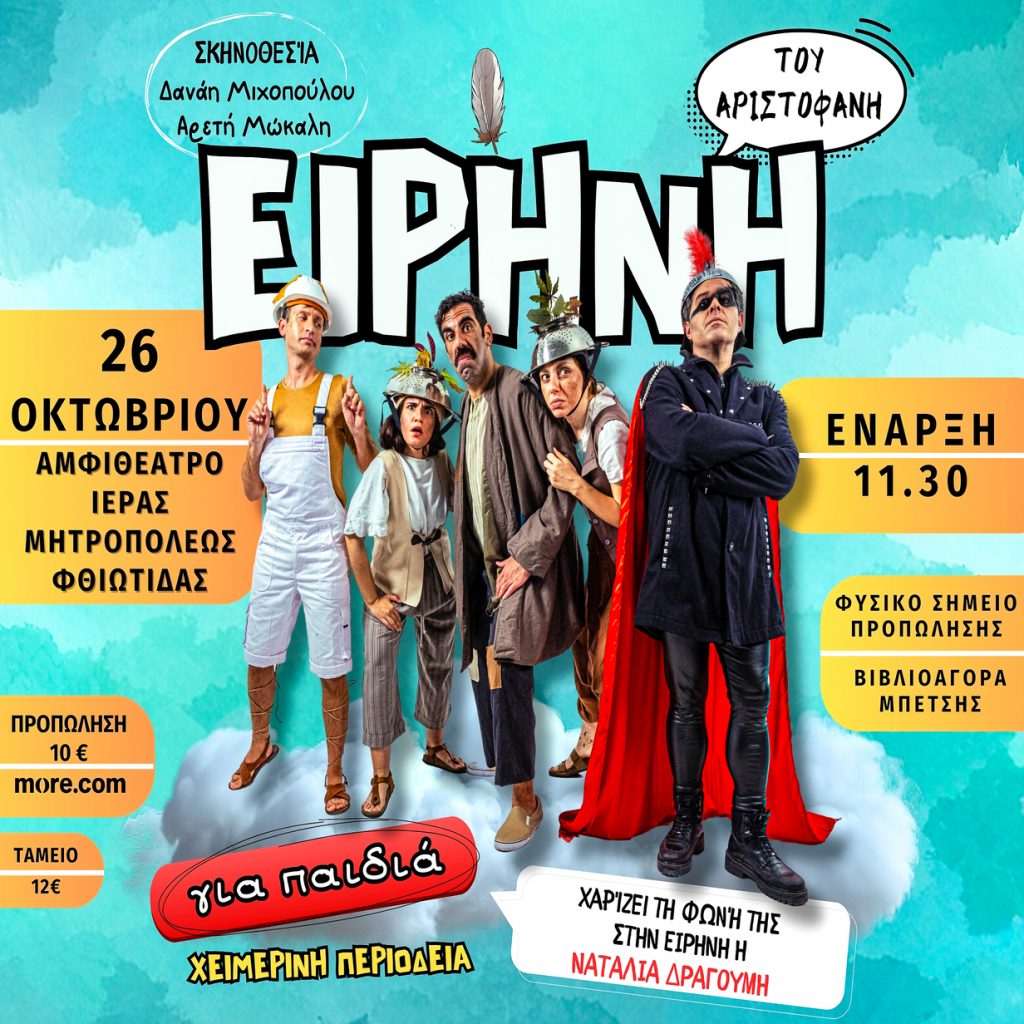Το Σάββατο 26 Οκτωβρίου, στις 11:30 το πρωί, στο Αμφιθέατρο της Μητρόπολης Φθιώτιδας (Λαμία) , θα πραγματοποιηθεί η θεατρική παράσταση "Ειρήνη του Αριστοφάνη για παιδιά".
