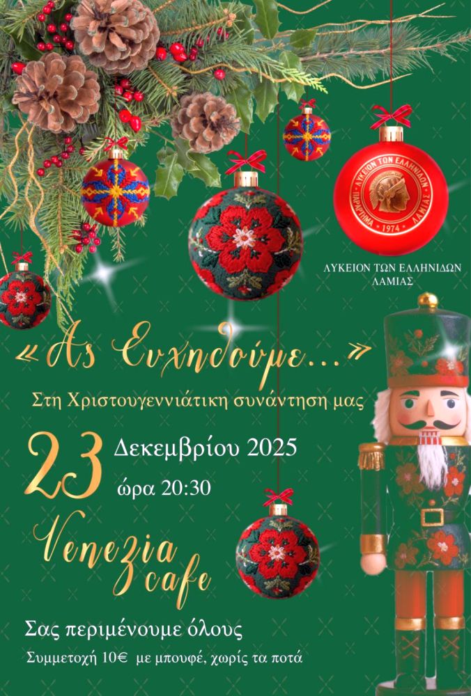 Το Λύκειον των Ελληνίδων Λαμίας σας προσκαλεί την Τρίτη 23 Δεκεμβρίου 2025, από τις 20:30', στο καφέ Venezia, στη χριστουγεννιάτικη συνάντηση «Ας ευχηθούμε...».