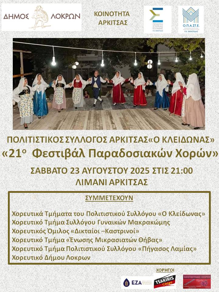 Ο Πολιτιστικός Σύλλογος Αρκίτσας "Ο Κλείδωνας" διοργανώνει το 21ο Φεστιβάλ Παραδοσιακών Χορών, στο λιμάνι Αρκίτσας.