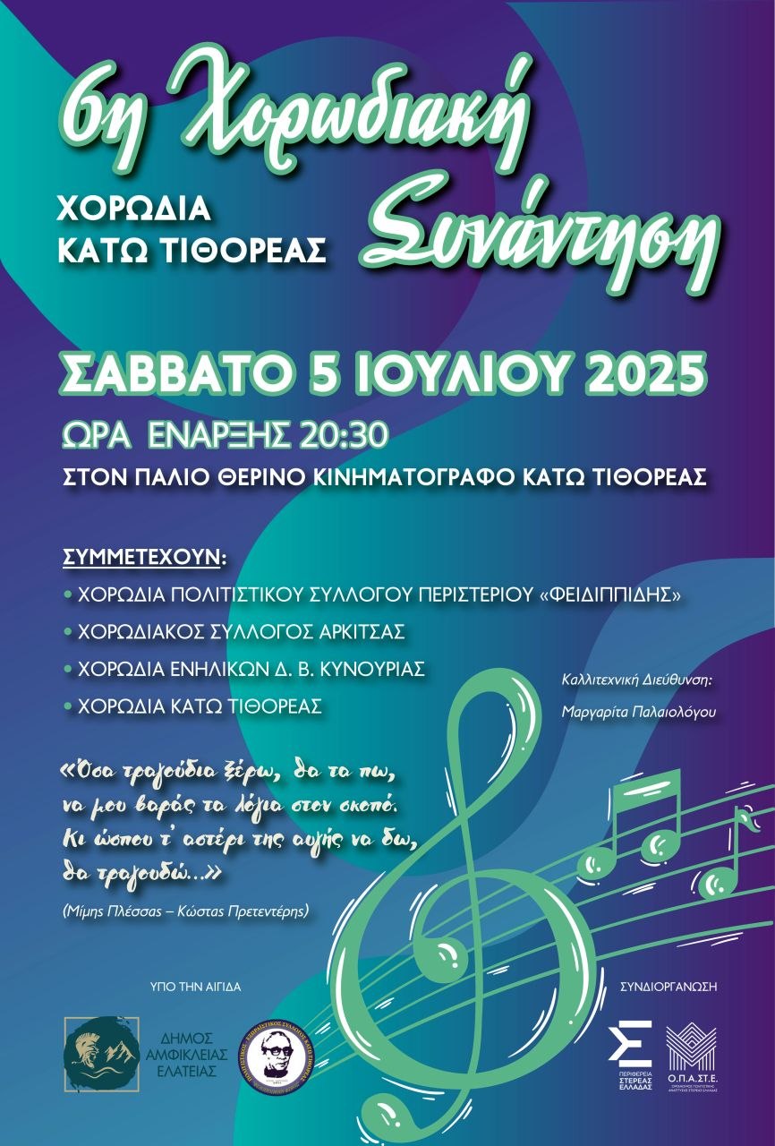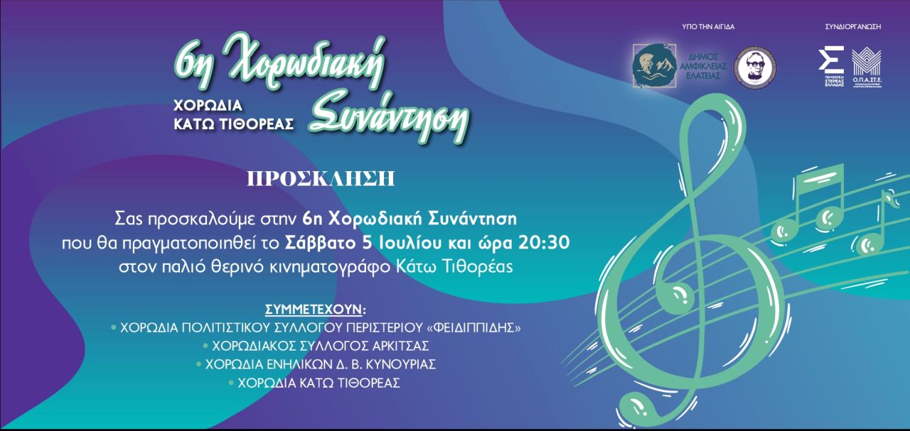 Ο Δήμος Αμφίκλειας Ελάτειας διοργανώνει την 6η Χορωδιακή Συνάντηση, που θα πραγματοποιηθεί το Σάββατο 5 Ιουλίου και ώρα 8:30', στον παλιό θερινό κινηματογράφο Κάτω Τιθορέας.