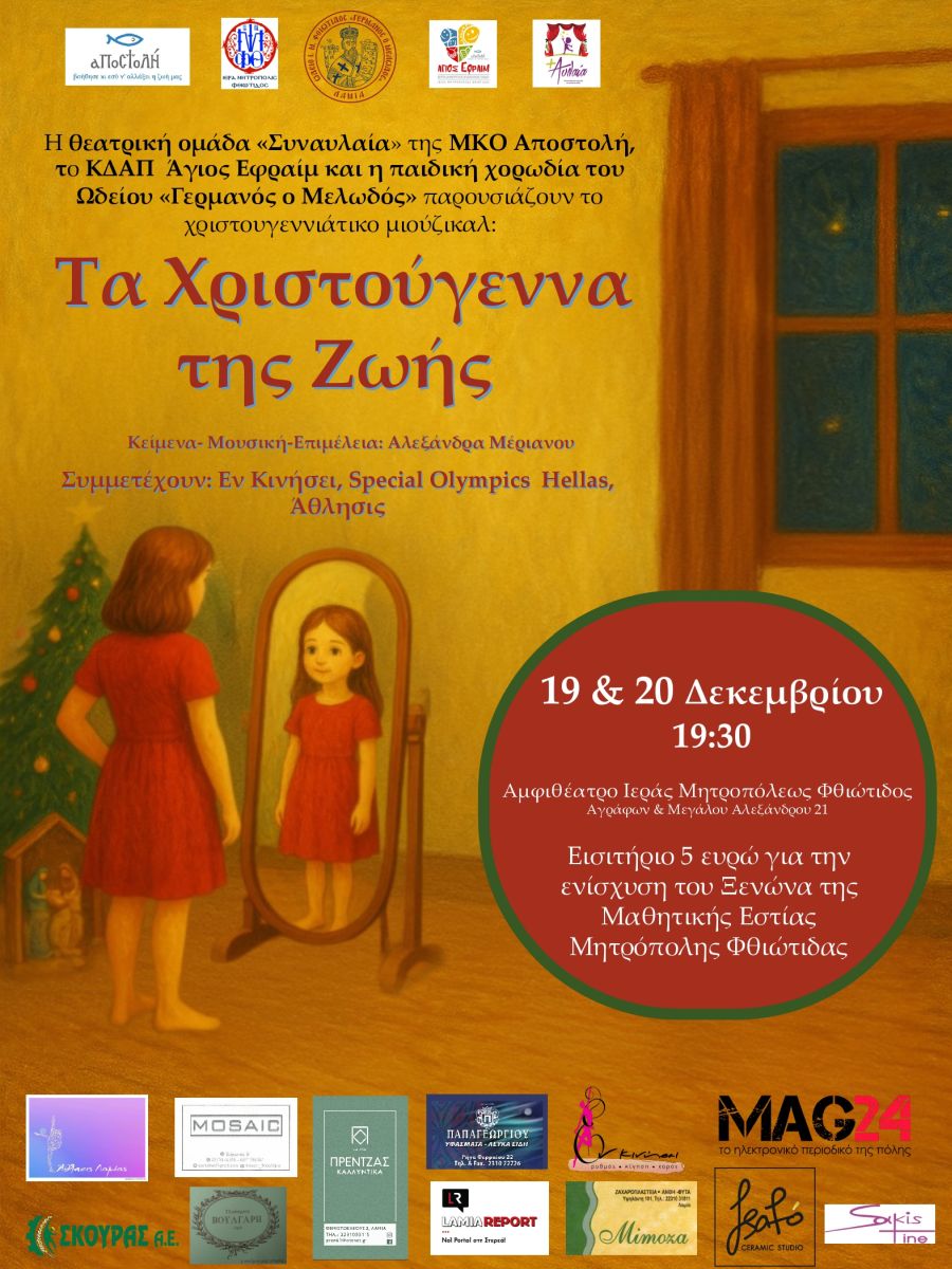 Η θεατρική ομάδα Συναυλαία, το ΚΔΑΠ Άγιος Εφραίμ, το Ωδείο Γερμανος ο Μελωδός, με τη συμμετοχή του Συλλόγων Άθλησις, Εν Κινήσει Λαμίας καθώς και της Ομάδας Special Olympics Hellas παρουσιάζουν για 2 παραστάσεις στις 19 και 20 Δεκεμβρίου στις 19:30', στο αμφιθέατρο της Ιεράς Μητροπόλεως Φθιώτιδας, το χριστουγεννιάτικο μιούζικαλ της Αλεξάνδρας Μέριανου "Τα Χριστούγεννα της Ζωής".