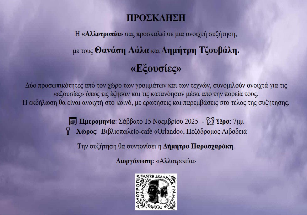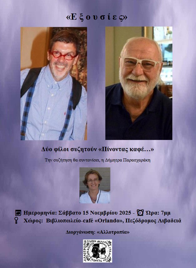«Εξουσίες»: Το Σάββατο 15 Νοεμβρίου 2025, στις 7:00' το απόγευμα, στο Βιβλιοπωλείο - cafe "Orlando", στον πεζόδρομο της Λιβαδειάς.