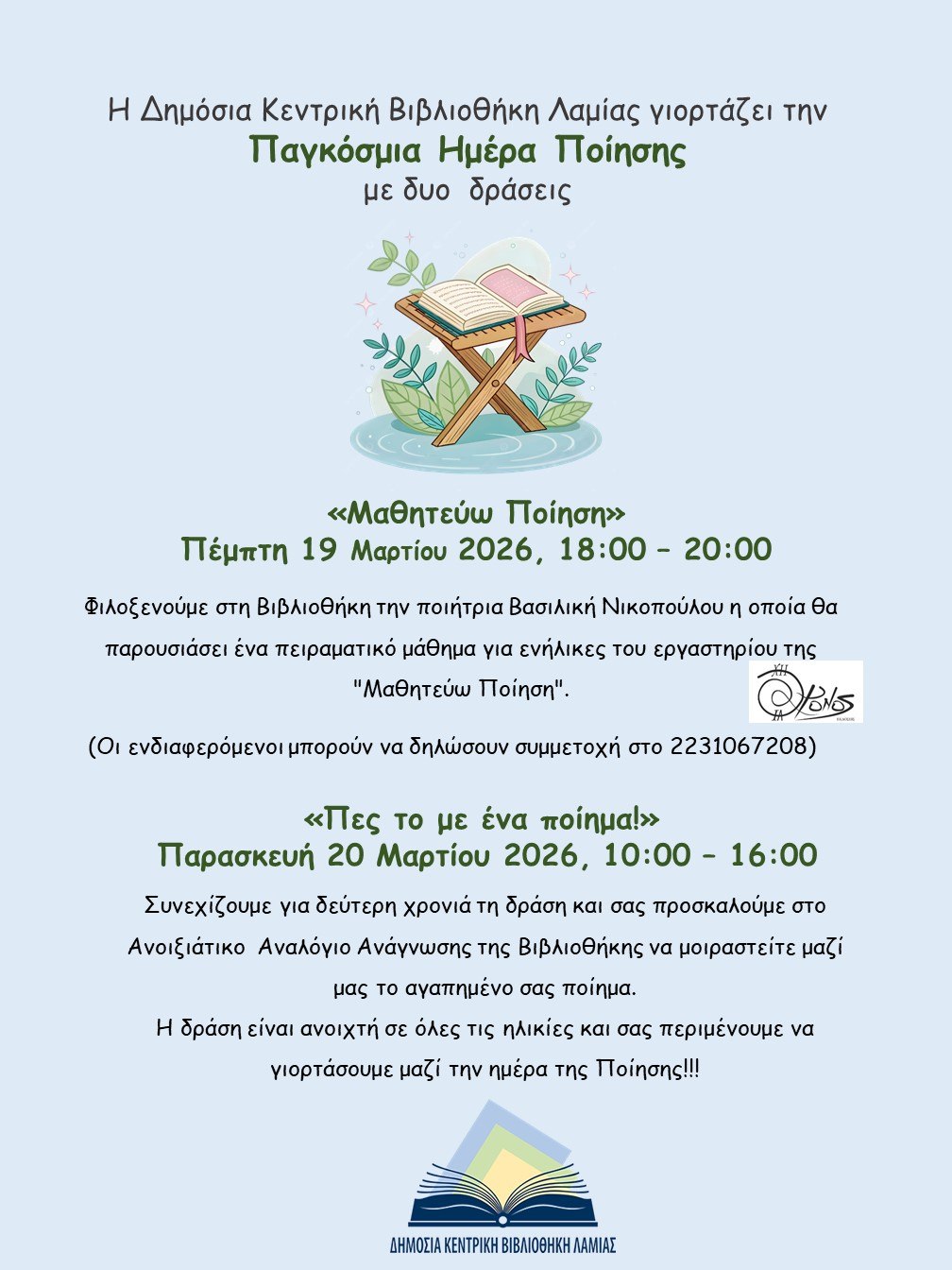 Η Δημόσια Κεντρική Βιβλιοθήκη Λαμίας γιορτάζει και φέτος την Παγκόσμια Ημέρα Ποίησης