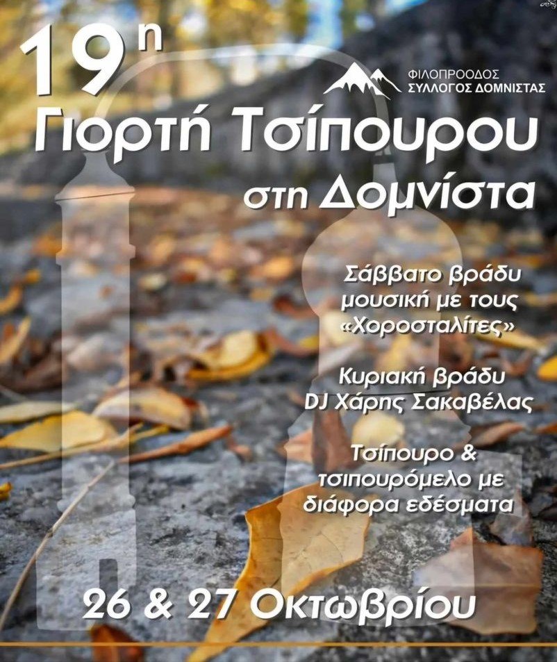 Ο Φιλοπρόοδος Σύλλογος Δομνίστας Ευρυτανίας διοργανώνει και φέτος, για 19η χρονιά, τη Γιορτή Τσίπουρου με ένα διήμερο εκδηλώσεων.