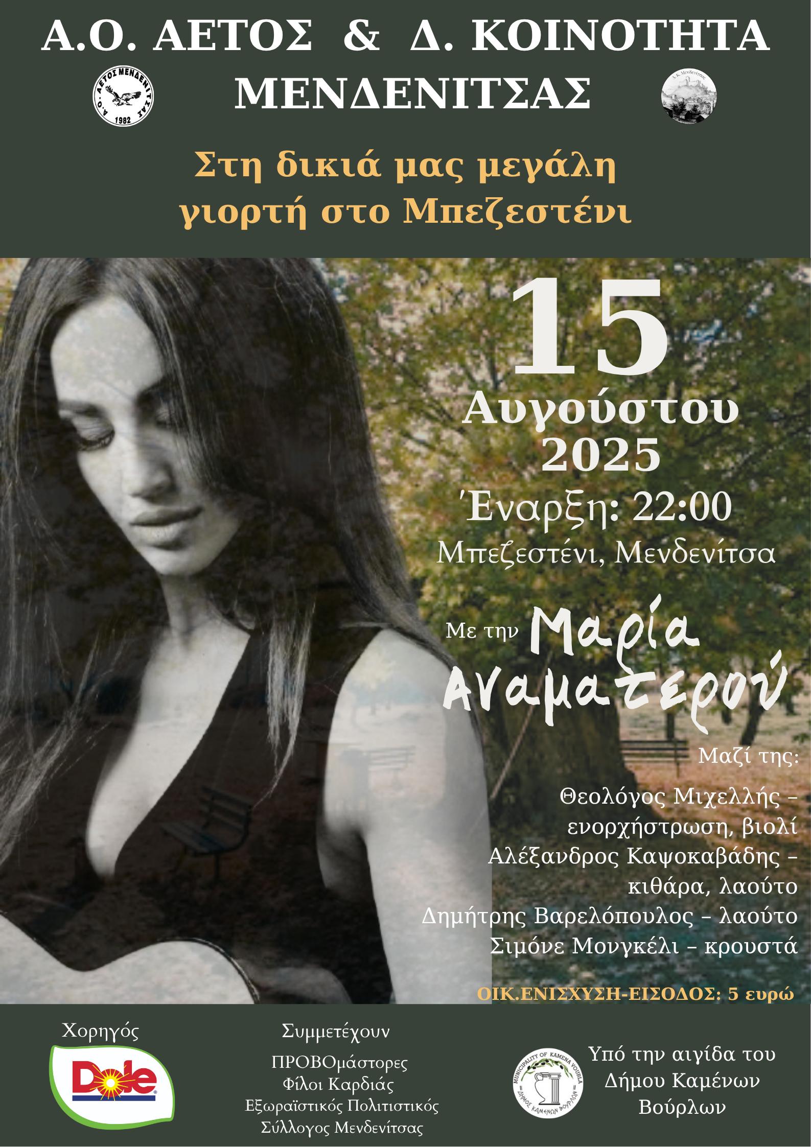 Η Μαρία Αναματερού, μία ερμηνεύτρια με ταυτότητα και ιδιαίτερη φωνή, έρχεται την Παρασκευή 15 Αυγούστου στο Μπεζεστένι, στη Μενδενίτσα.