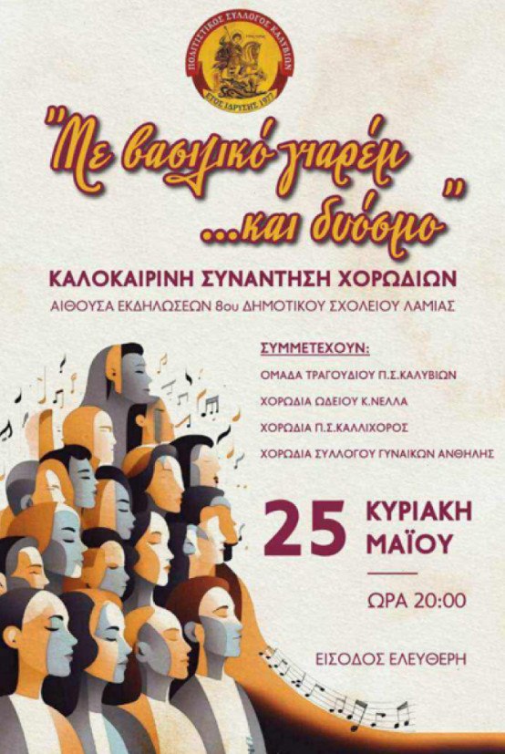 Η χορωδία του Πολιτιστικού Συλλόγου Καλυβίων "Οι μελωδοί" διοργανώνει καλοκαιρινή συνάντηση χορωδιών "Με βασιλικό γαρύφαλλο...και δυόσμο", που θα γίνει την Κυριακή 25 Μαΐου 2025 και ώρα 20:00 στην αίθουσα εκδηλώσεων του 8ου Δημοτικού Σχολείου Λαμίας.