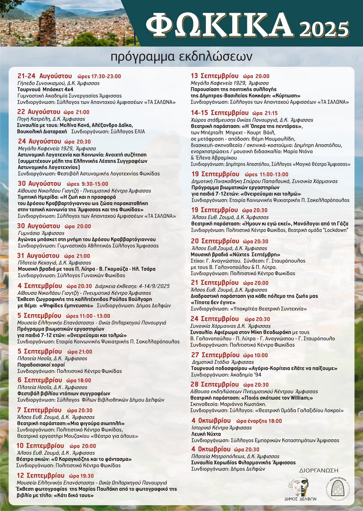 Με ένα πλούσιο πρόγραμμα εκδηλώσεων, για μικρούς και μεγάλους, τα «Φωκικά 2025» υπόσχονται να μας χαρίσουν και φέτος όμορφες στιγμές, όπως τις επιμελήθηκε ο Δήμος Δελφών, το Δίκτυο για τον Πολιτισμό και τον Τουρισμό στη Φωκίδα «Δίκτυο Δελφών» και η Δημοτική Κοινότητα Άμφισσας, σε συνεργασία με Συλλόγους και ομάδες πολιτών.