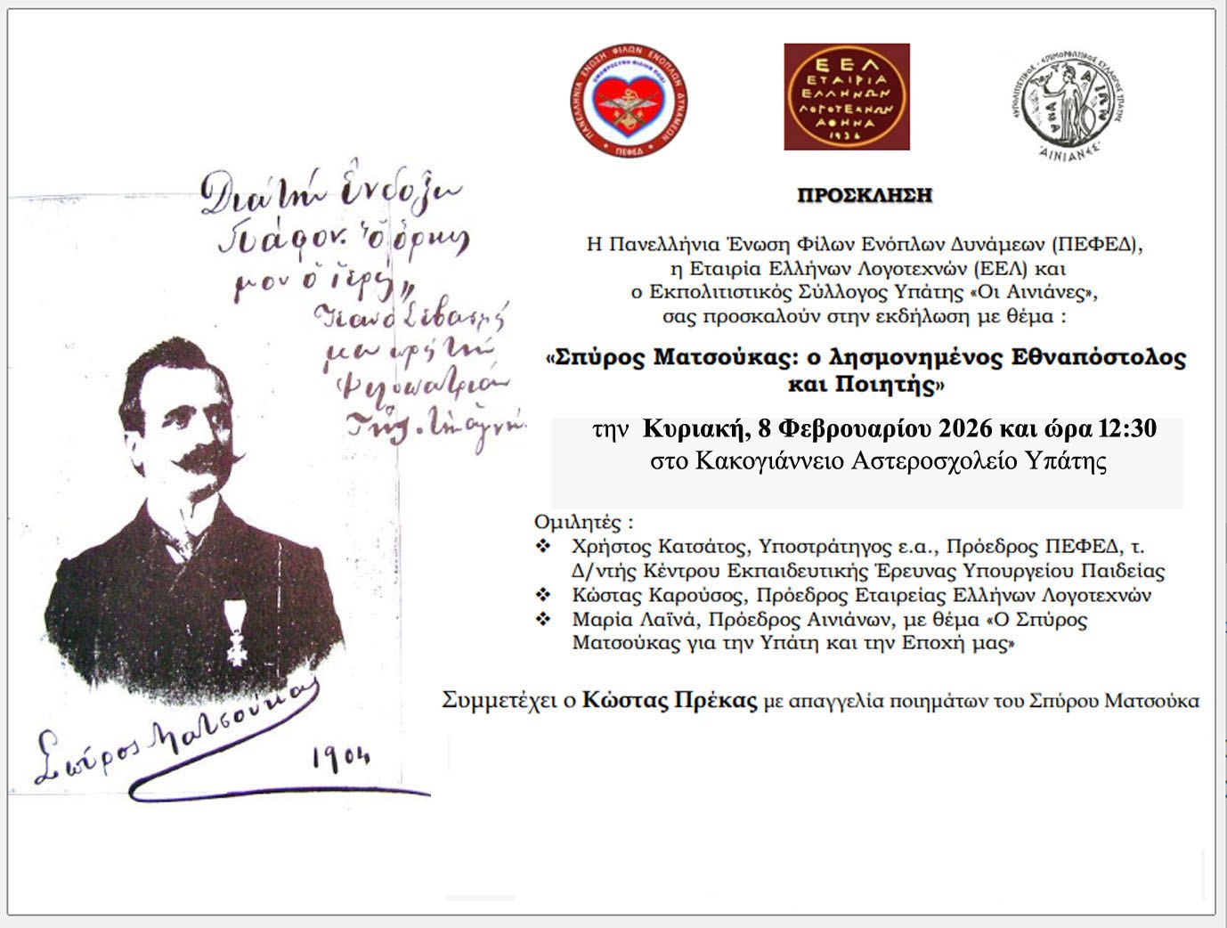 Η Πανελλήνια Ένωση Φίλων Ενόπλων Δυνάμεων (ΠΕΦΕΔ), η Εταιρία Ελλήνων Λογοτεχνών (ΕΕΛ) και ο Εκπολιτιστικός Σύλλογος Υπάτης «Οι Αινιάνες», σας προσκαλούν στην εκδήλωση με θέμα :« Σπύρος Ματσούκας: ο λησμονημένος Εθναπόστολος και Ποιητής», την Κυριακή 08 Φεβρουαρίου 2026 και ώρα 12:30, στο Κακογιάννειο Αστεροσχολείο Υπάτης.