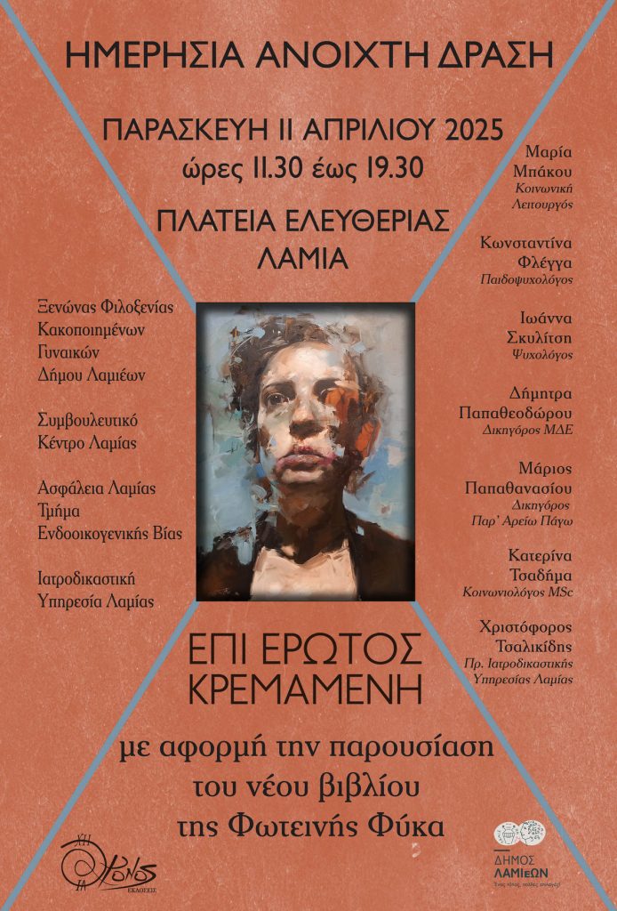 Μία Ημερήσια Ανοιχτή Δράση, αφιερωμένη στις κακοποιημένες γυναίκες, διοργανώνουν με αφορμή τη νέα ποιητική συλλογή "Επί Έρωτος Κρεμάμενη", της συγγραφέως Φωτεινής Φύκα, οι Χρόνος Εκδόσεις, υπό την Αιγίδα του Δήμου Λαμιέων.