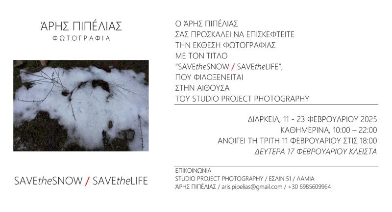 Ο Άρης Πιπέλιας σας καλεί να γνωρίσετε την Έκθεση Φωτογραφίας με τίτλο "SAVE the SNOW - SAVE the LIFE", που θα πραγματοποιηθεί από 11 Φεβρουαρίου έως 23 Φεβρουαρίου 2025, στο Studio Project Photography, στην οδό Έσλιν 51.