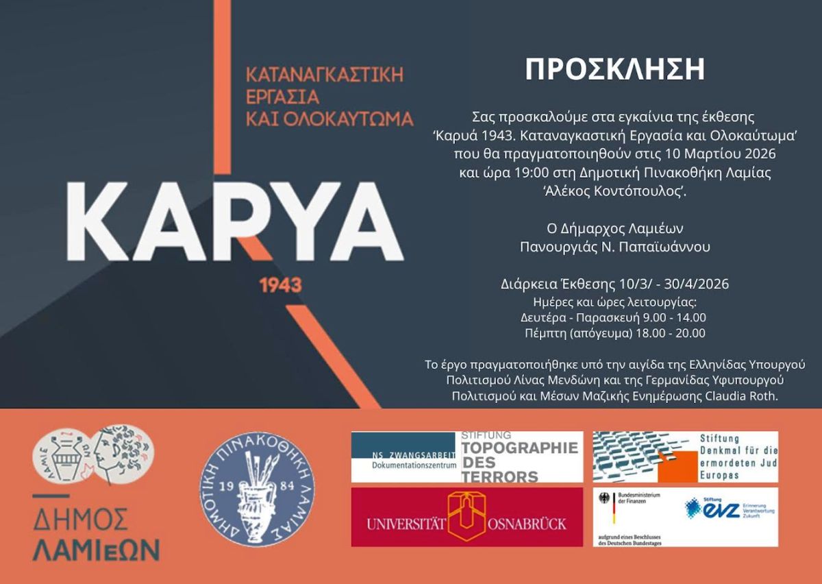 Ο Δήμος Λαμιέων και η Δημοτική Πινακοθήκη Λαμίας «Αλέκος Κοντόπουλος» φιλοξενούν από τις 10 Μαρτίου 2026 έως 30 Απριλίου 2026 την Έκθεση Συλλογικής Ιστορικής Μνήμης «Καρυά 1943. Καταναγκαστική εργασία και Ολοκαύτωμα».