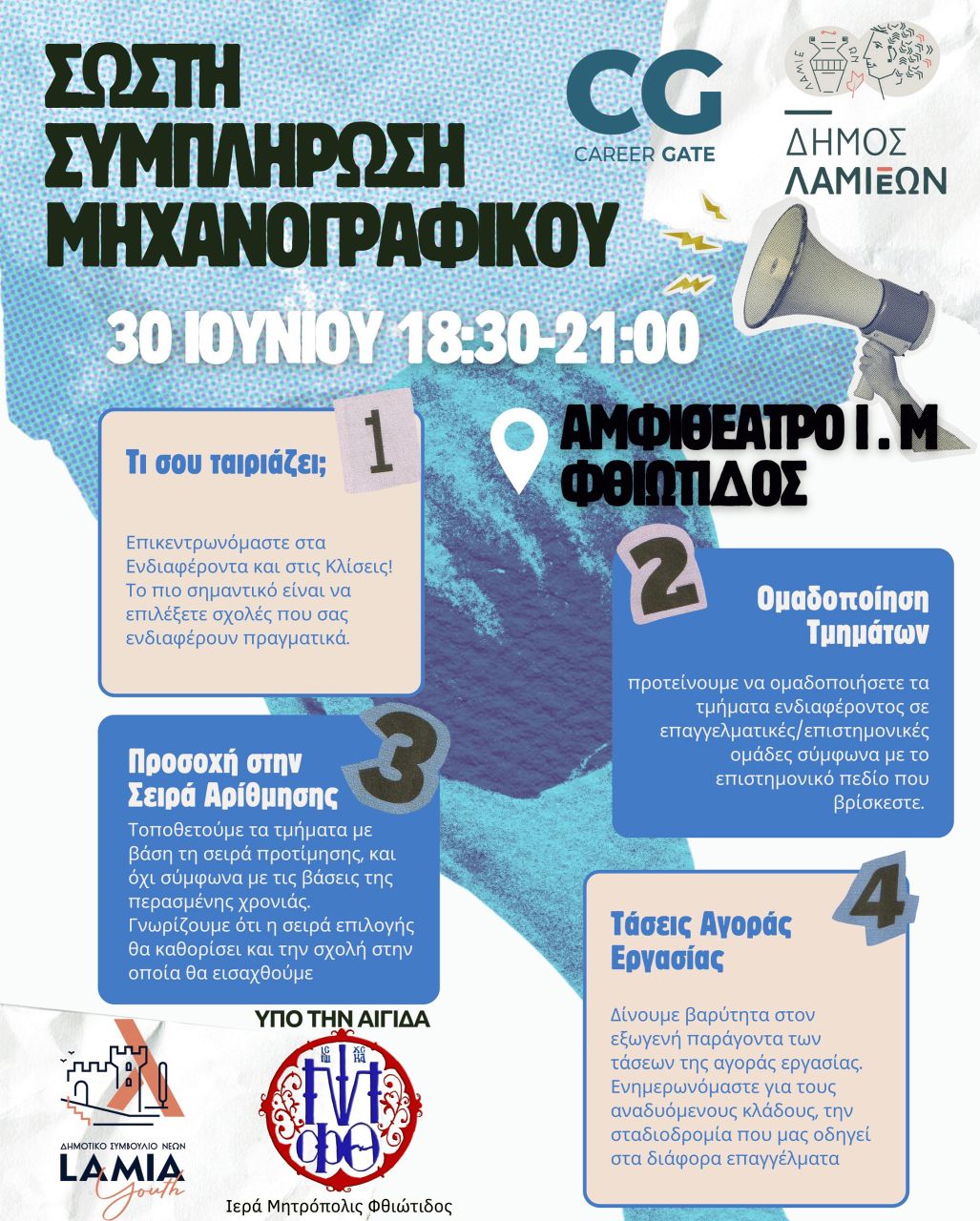 Το Συμβούλιο Νέων σε συνεργασία με την εταιρεία «CareerGate» διοργανώνει, τη Δευτέρα 30 Ιουνίου 2025 και ώρα 18:30 μ.μ., στο αμφιθέατρο της Ιεράς Μητρόπολης Φθιώτιδας, την εκδήλωση του με τίτλο «Σωστή Συμπλήρωση Μηχανογραφικού».