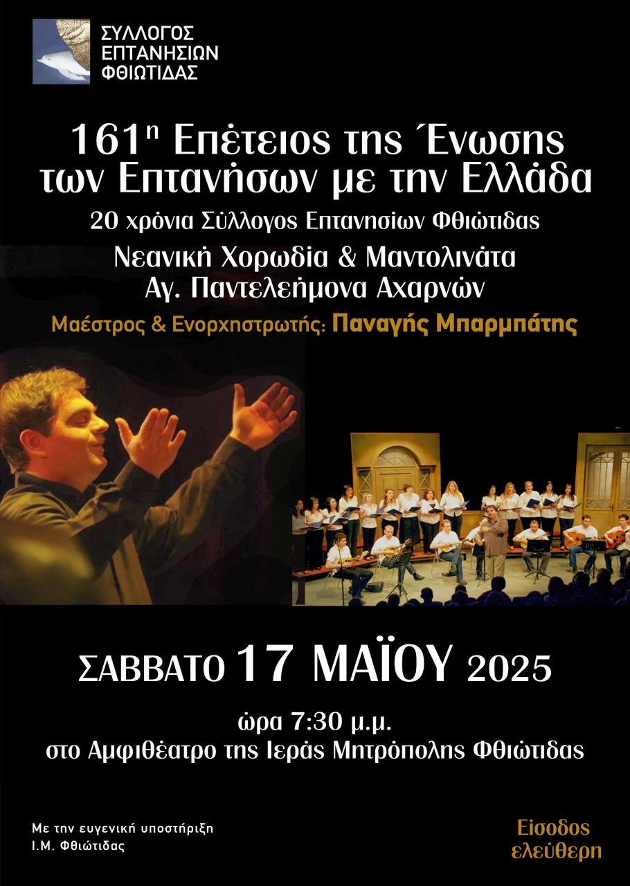 Ο Σύλλογος Επτανησίων Φθιώτιδας σας προσκαλεί στην εκδήλωση που διοργανώνει για την 161η Επέτειο της Ένωσης των Επτανήσων με την Ελλάδα και για τα 20 χρόνια από την Ίδρυση του Συλλόγου το Σάββατο 17 Μαΐου 2025 & ώρα 7.30 μ.μ. στο Αμφιθέατρο της Ιεράς Μητρόπολης Φθιώτιδας.