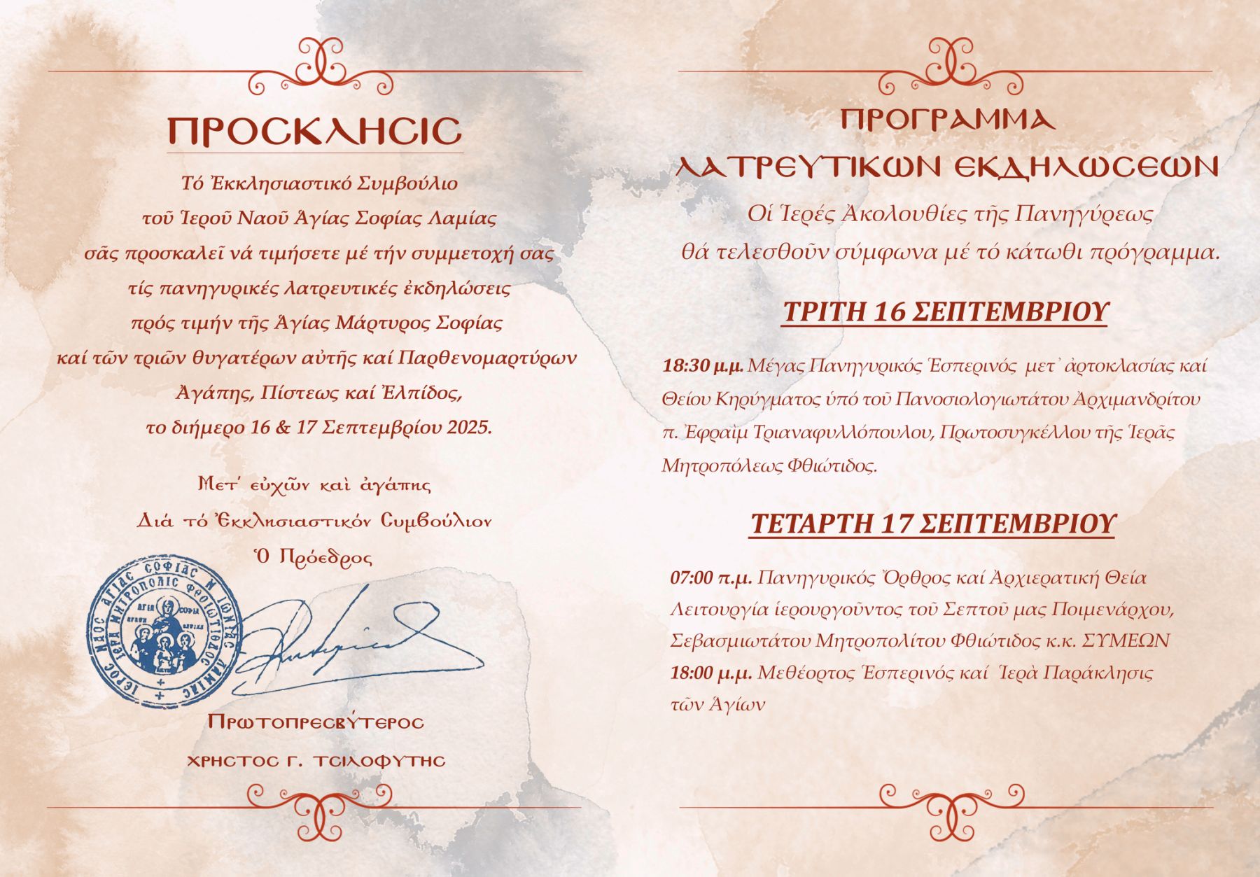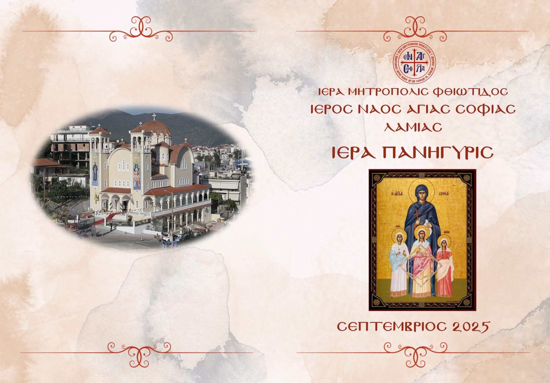Πανηγυρίζει ο Ιερός Ναός της Αγίας Σοφίας στη Λαμία και σας προσκαλεί στις λατρευτικές ακολουθίες προς τιμήν της Αγίας.
