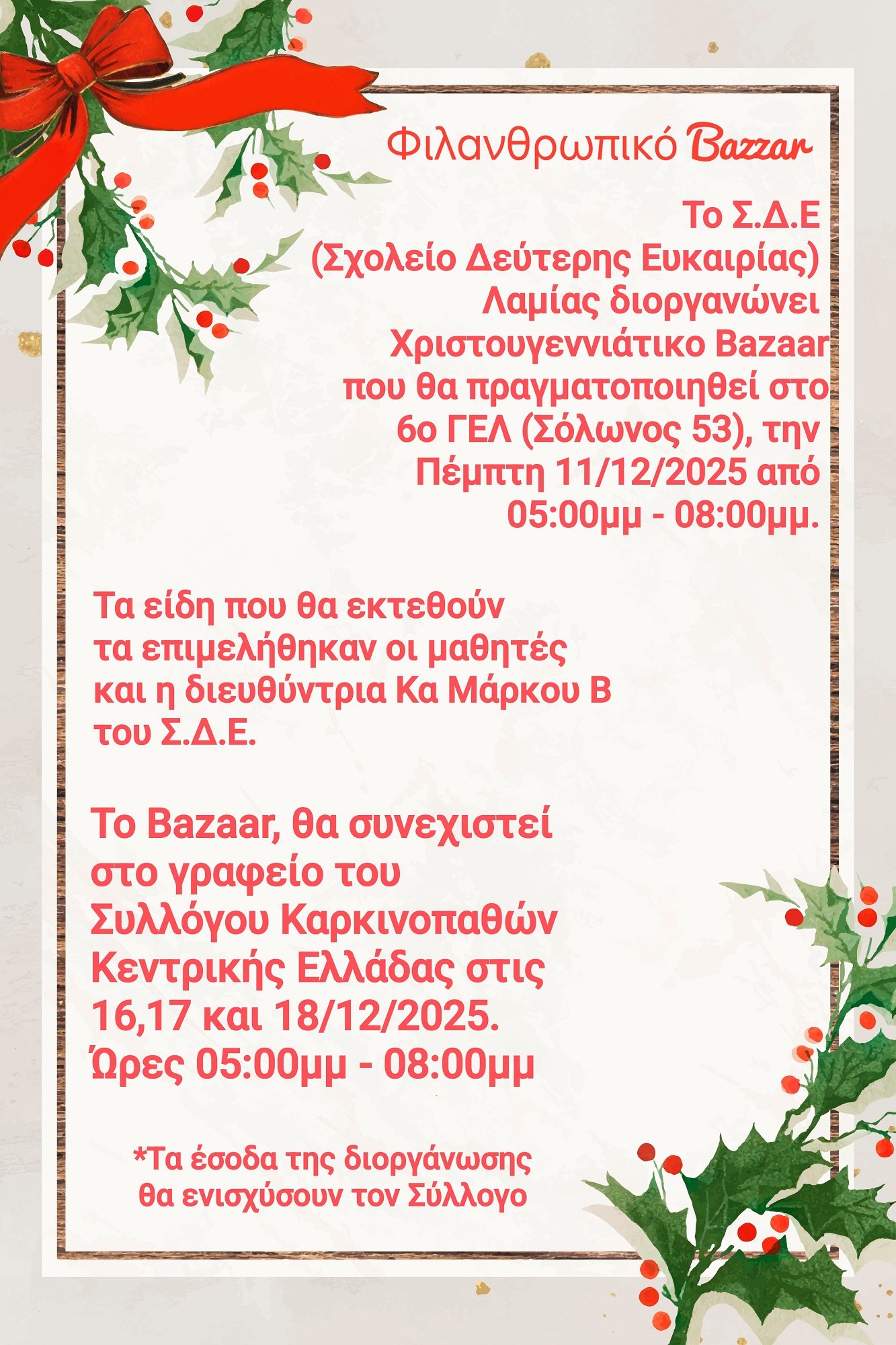 Το Σχολείο Δεύτερης Ευκαιρίας Λαμίας διοργανώνει Χριστουγεννιάτικο bazaar που θα πραγματοποιηθεί στο 6ο ΓΕΛ (Σόλωνος 53), την Πέμπτη 11 Δεκεμβρίου, 05:00 μμ - 08:00 μ.μ.