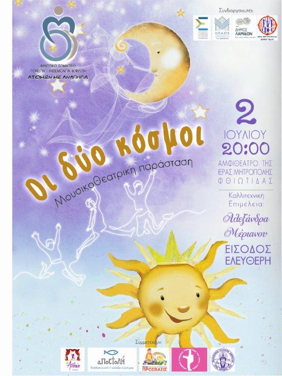 Η Θεατρική Παράσταση «Δύο Κόσμοι», που είχε προγραμματιστεί για τις προηγούμενες ημέρες και αναβλήθηκε λόγω του αιφνίδιου και βαθύτατου χαμού του Κώστα Σταυρογιάννη, θα πραγματοποιηθεί την Τετάρτη 2 Ιουλίου και ώρα 20.00 στο Αμφιθέατρο της Ιεράς Μητρόπολης Φθιώτιδας.