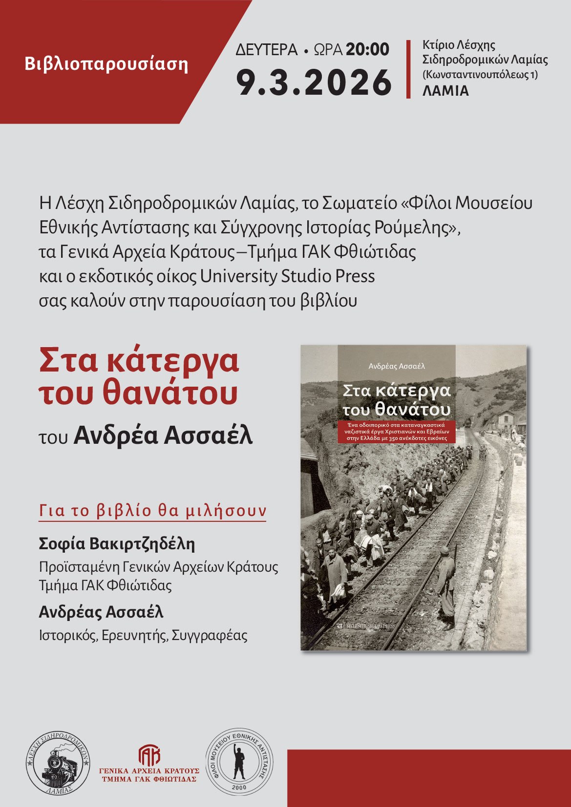 Η Λέσχη Σιδηροδρομικών Λαμίας, το Σωματείο «Φίλοι Μουσείου Εθνικής Αντίστασης και Σύγχρονης Ιστορίας Ρούμελης», τα Γενικά Αρχεία Κράτους–Τμήμα ΓΑΚ Φθιώτιδας και ο εκδοτικός οίκος University Studio Press μας προσκαλούν στην παρουσίαση του βιβλίου του Ανδρέα Ασσαέλ, «Στα κάτεργα του θανάτου», που θα γίνει τη Δευτέρα 9 Μαρτίου 2026 στις 20:00’ στο κτίριο της Λέσχης Σιδηροδρομικών Λαμίας, στην οδό Κωνσταντινουπόλεως 1.