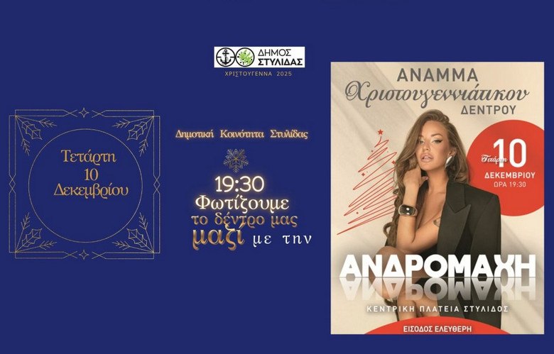 Την Τετάρτη (10/12/2025) το απόγευμα στις 19:30 «Πάρτε όλοι ρεπό από τη δουλειά» όπως λέει και το καινούριο τραγούδι της Ανδρομάχης, για να την απολαύσετε στο άναμμα του Χριστουγεννιάτικου δέντρου στην κεντρική πλατεία της Στυλίδας.