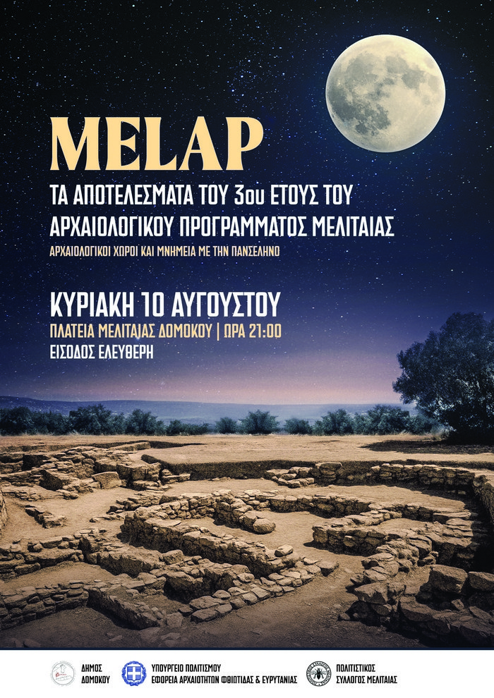 Ο Δήμος Δομοκού, σε συνεργασία με το Υπουργείο Πολιτισμού (Εφορεία Αρχαιοτήτων Φθιώτιδας & Ευρυτανίας) και τον Πολιτιστικό Σύλλογο Μελιταίας, διοργανώνει ειδική εκδήλωση για την παρουσίαση των αποτελεσμάτων του 3ου έτους του Αρχαιολογικού Προγράμματος Μελιταίας (MELAP).