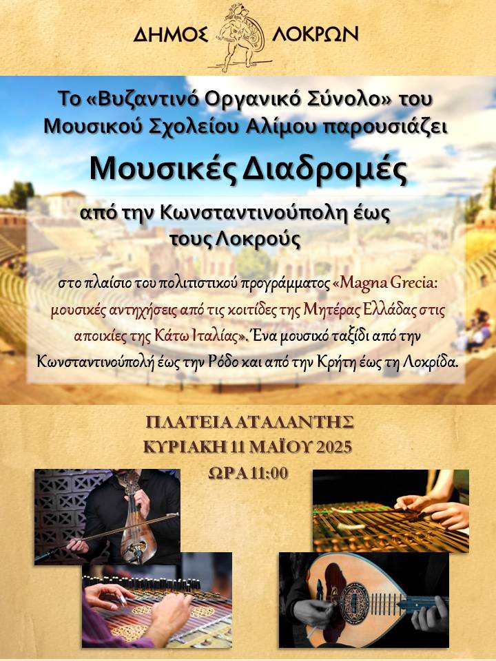 Το «Βυζαντινό Οργανικό Σύνολο» του Μουσικού Σχολείου Αλίμου παρουσιάζει τις ''Μουσικές Διαδρομές'' από την Κωνσταντινούπολη έως τους Λοκρούς, την Κυριακή 11 Μαΐου 2025 και ώρα 11:00 στην πλατεία Αταλάντης.