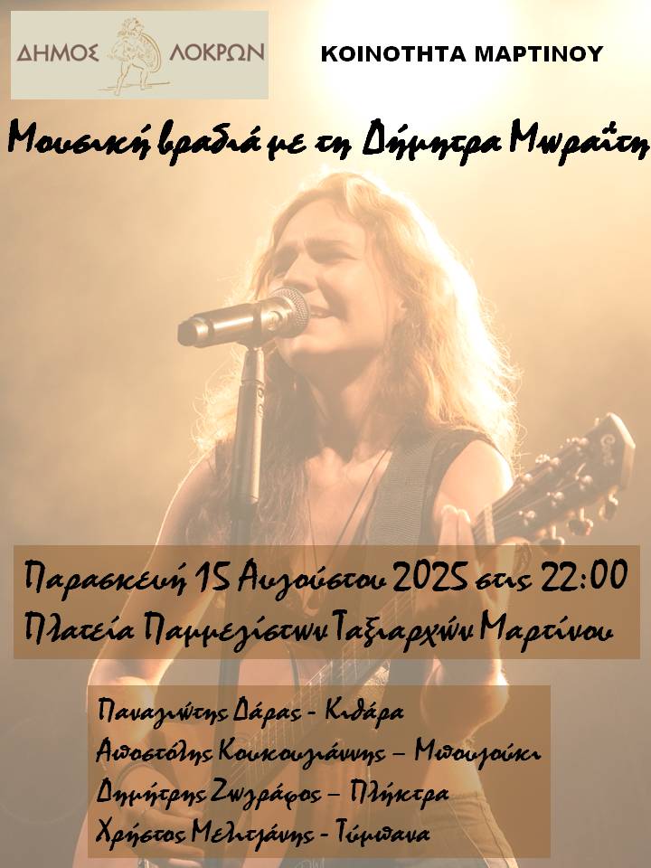 Η μουσική βραδιά, με τη Δήμητρα Μωραΐτη, θα γίνει στην πλατεία των Παμμεγίστων Ταξιαρχών στο Μαρτίνο.