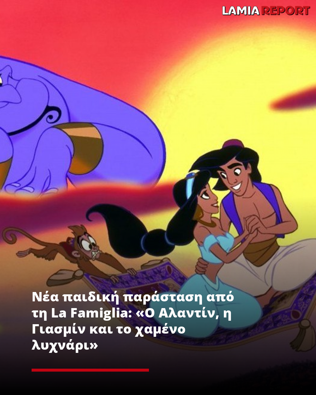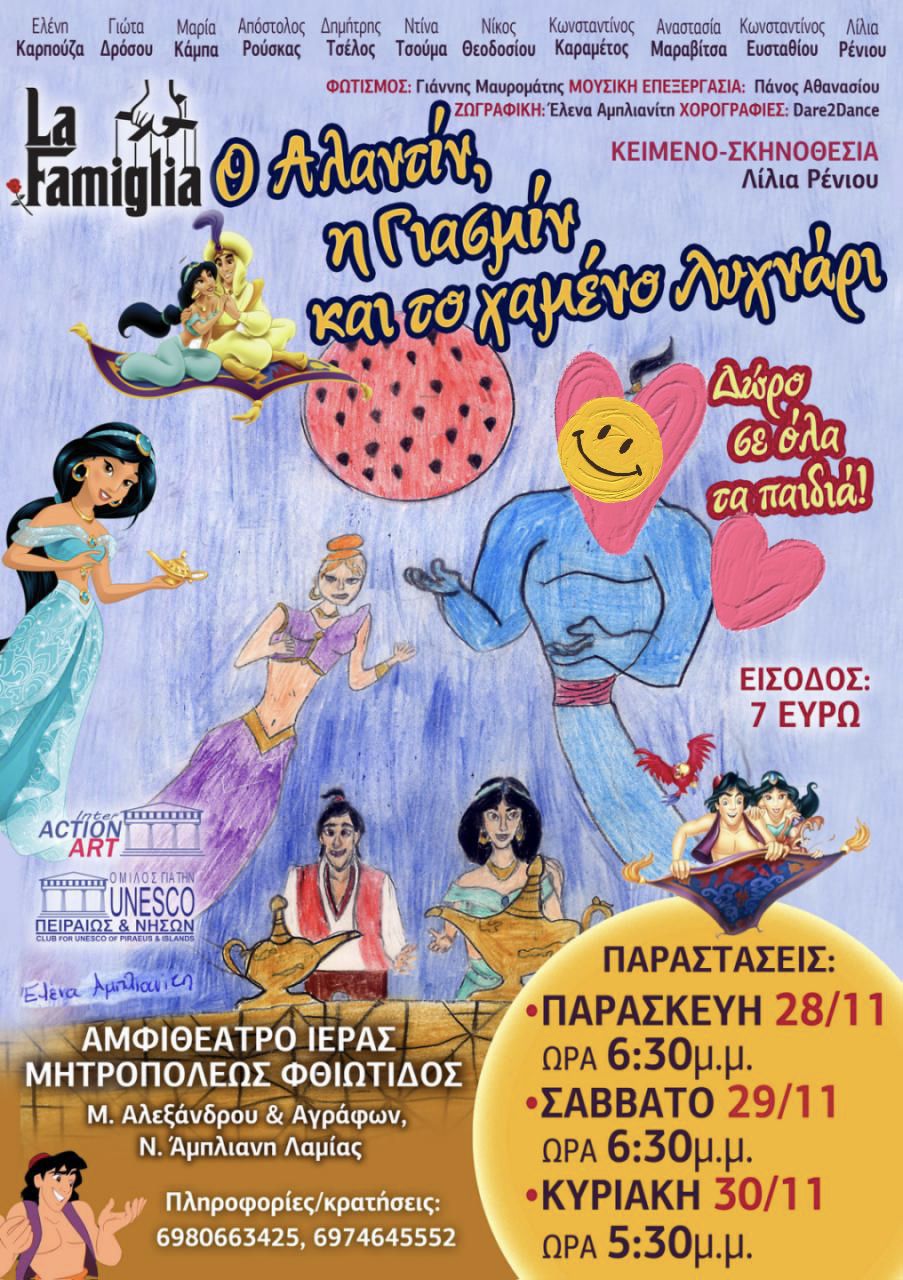 Η θεατρική ομάδα La Famiglia σας προσκαλεί στη νέα της παιδική παράσταση «Ο Αλαντίν, η Γιασμίν και το χαμένο λυχνάρι», σε σενάριο και σκηνοθεσία της Λίλιας Ρένιου.