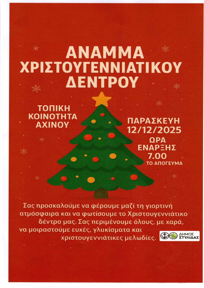 Η τοπική κοινότητα Αχινού σας προσκαλεί την Παρασκευή (12/12/2025) και ώρα 7:00 το απόγευμα στη φωταγώγηση του χριστουγεννιάτικου δέντρου της.