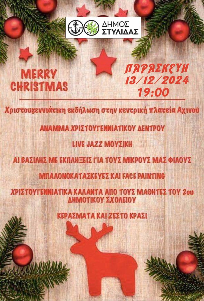 Ο Δήμος Στυλίδας και η Κοινότητα Αχινού φωταγωγούν το Χριστουγεννιάτικο δέντρο, την Παρασκευή 13 Δεκεμβρίου 2024, στην κεντρική πλατεία, στο πλαίσιο μιας Χριστουγεννιάτικης εκδήλωσης.