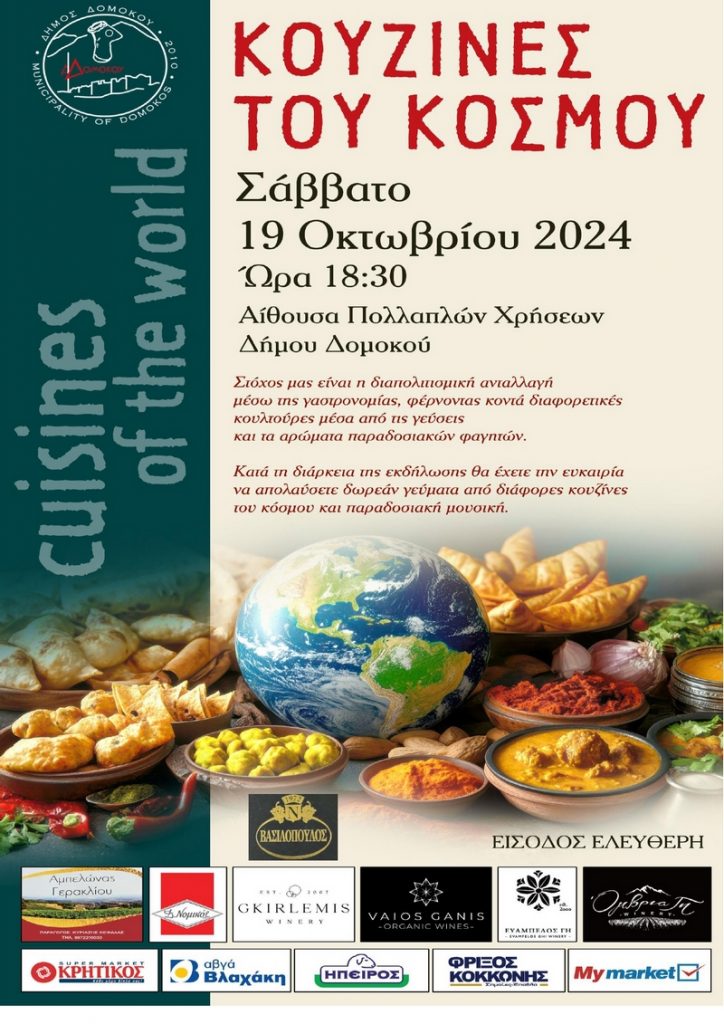 Ο Δήμος Δομοκού διοργανώνει την πολυπολιτισμική εκδήλωση "Κουζίνες του Κόσμου", η οποία θα πραγματοποιηθεί το Σάββατο 19 Οκτωβρίου 2024 στην Αίθουσα Πολλαπλών Χρήσεων.