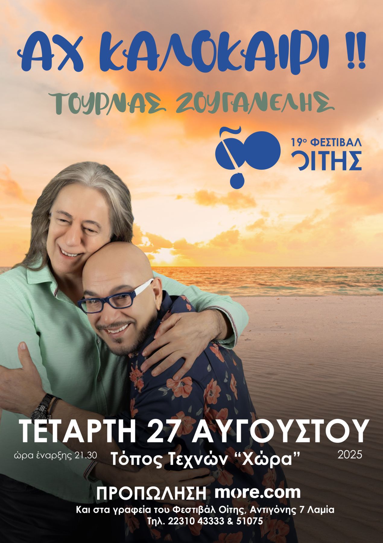 Την Τετάρτη 27 Αυγούστου 2025, στις 9.30 το βράδυ, στον Τόπο Τεχνών “Χώρα”, στα Λελέικα Υπάτης, το 19ο Φεστιβάλ Οίτης φιλοξενεί τους αγαπημένους καλλιτέχνες Γιάννη Ζουγανέλη και Κώστα Τουρνά με την μουσική παράσταση “Αχ Καλοκαίρι!”.