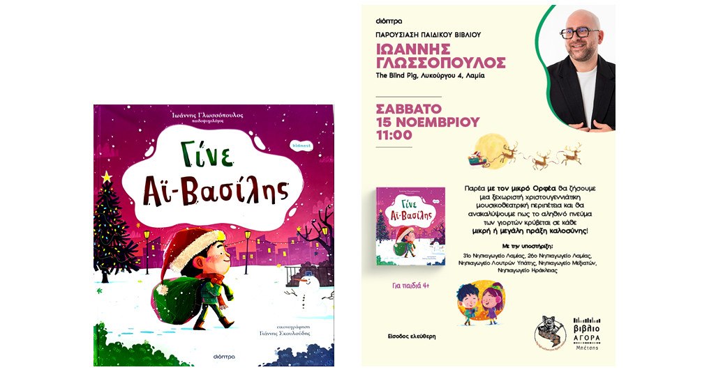 Το δεύτερο παιδικό βιβλίο του παιδοψυχολόγου και σύμβουλου γονέων, κου Ιωάννη Γλωσσόπουλου, με τίτλο «Γίνε Αϊ- Βασίλης», παρουσιάζουν τα 26ο και 31ο Νηπιαγωγεία Λαμίας, Λουτρών Υπάτης και Ηράκλειας, σε συνεργασία με το βιβλιοπωλείο «Μπέτσης Βιβλιοαγορά» και τις εκδόσεις «Διόπτρα».