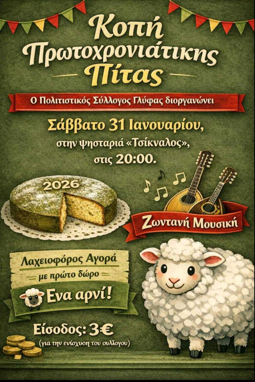 Το Σάββατο 31 Ιανουαρίου 2026 στις 20:00’ στην ψησταριά «Τσίκναλος» ο Πολιτιστικός Σύλλογος Γλύφας διοργανώνει εκδήλωση με την κοπή της πρωτοχρονιάτικης πίτας.