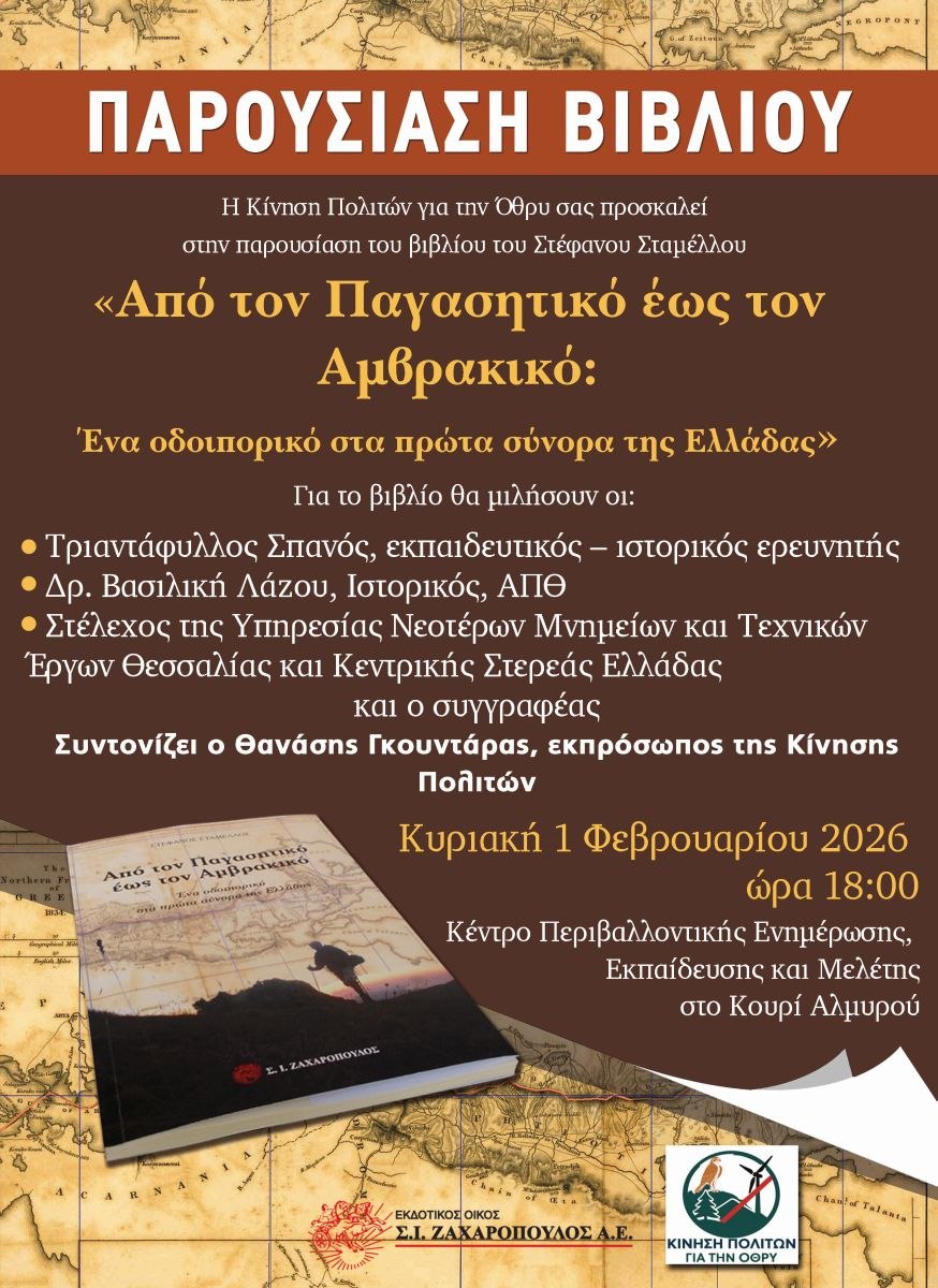 Η Κίνηση Πολιτών για την Όθρυ σας προσκαλεί στην παρουσίαση του βιβλίου του Στέφανου Σταμέλλου με τίτλο «Από τον Παγασητικό έως τον Αμβρακικό: Ένα οδοιπορικό στα πρώτα σύνορα της Ελλάδας» που θα πραγματοποιηθεί την Κυριακή 1η Φεβρουαρίου 2026 και ώρα 18:00 στο Κέντρο Περιβαλλοντικής Ενημέρωσης, Εκπαίδευσης και Μελέτης στο Κουρί Αλμυρού.