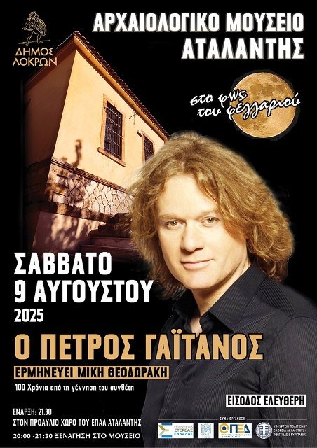 - Στις ξεναγήσεις για το κοινό στην Αρχαιολογική Συλλογή Αταλάντης (από 20:00 έως 21:30) και τη μουσική εκδήλωση με τον Πέτρο Γαϊτάνο, αφιερωμένη στα 100 χρόνια από τη γέννηση του Μίκη Θεοδωράκη, στον προαύλιο χώρο του ΕΠΑΛ Αταλάντης, σε συνεργασία με τον Δήμο Λοκρών, την Περιφέρεια Στερεάς Ελλάδας, τον Ο.Π.Α.ΣΤ.Ε. και τον Ο.Π.Ε.Δ. (ώρα έναρξης 21:30). Η Αρχαιολογική Συλλογή Αταλάντης θα παραμείνει ανοιχτή για το κοινό από 20:00 έως 24:00.