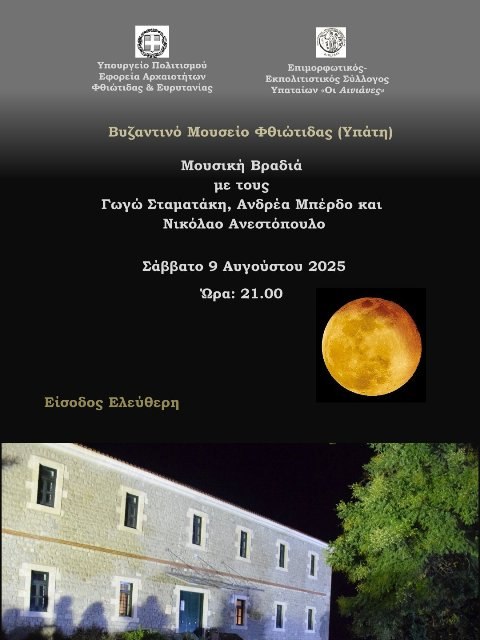 - Στη μουσική βραδιά με τους Γωγώ Σταματάκη, Ανδρέα Μπέρδο και Νικόλαο Ανεστόπουλο, το Σάββατο 9 Αυγούστου 2025, στο Βυζαντινό Μουσείο Φθιώτιδας στην Υπάτη, σε συνεργασία με τον Επιμορφωτικό-Εκπολιτιστικό Σύλλογο Υπαταίων «Οι Αινιάνες» (ώρα έναρξης: 21:000). Το Βυζαντινό Μουσείο Φθιώτιδας θα παραμείνει ανοιχτό για το κοινό από 20:00 έως 24:00.