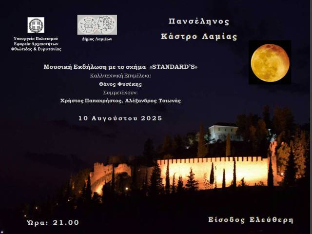 - Στη μουσική εκδήλωση στο Κάστρο της Λαμίας, σε συνεργασία με τον Δήμο Λαμιέων, την Κυριακή 10 Αυγούστου 2025, με το μουσικό σχήμα ''STANDARD’S'' υπό την καλλιτεχνική επιμέλεια του Θάνου Φυσέκη (ώρα έναρξης 21:00). Ο αρχαιολογικός χώρος του Κάστρου Λαμίας θα παραμείνει ανοιχτός για το κοινό από 20:00 έως 24:00.