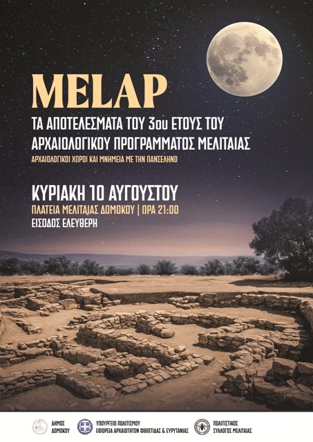 - Στην εκδήλωση, που συνδιοργανώνεται με τον Δήμο Δομοκού και τον Πολιτιστικό Σύλλογο Μελιταίας, για την παρουσίαση των αποτελεσμάτων του 3ου έτους του Αρχαιολογικού Προγράμματος Μελιταίας (MELAP), την Κυριακή 10 Αυγούστου 2025, στην Πλατεία Μελιταίας (ώρα έναρξης: 21:00).