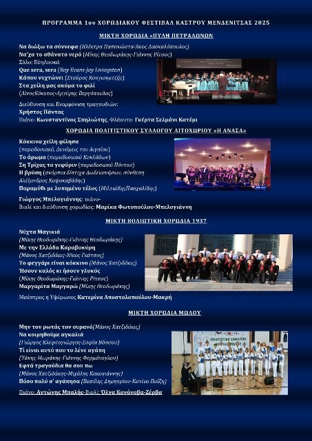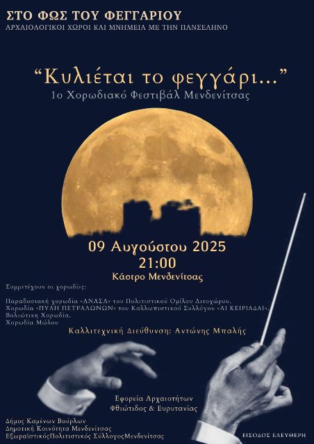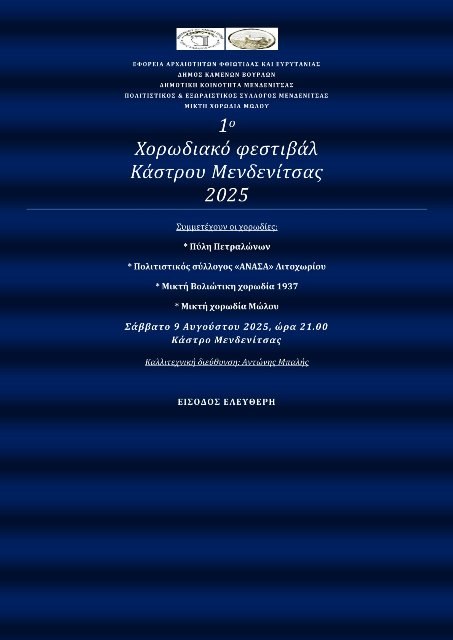 - Στο χορωδιακό φεστιβάλ στο Κάστρο Μενδενίτσας, το Σάββατο 9 Αυγούστου 2025, σε συνεργασία με τον Δήμο Καμένων Βούρλων, τη Δημοτική Κοινότητα Μενδενίτσας, τον Εξωραϊστικό Πολιτιστικό Σύλλογο Μενδενίτσας και τη Μικτή Χορωδία Μώλου. Συμμετέχουν οι χορωδίες: Πύλη Πετραλώνων, Πολιτιστικός Σύλλογος «ΑΝΑΣΑ» Λιτοχωρίου, Μικτή Βολιώτικη Χορωδία 1937, Μικτή Χορωδία Μώλου υπό την καλλιτεχνική διεύθυνση του Αντώνη Μπαλή (ώρα έναρξης: 21:00).