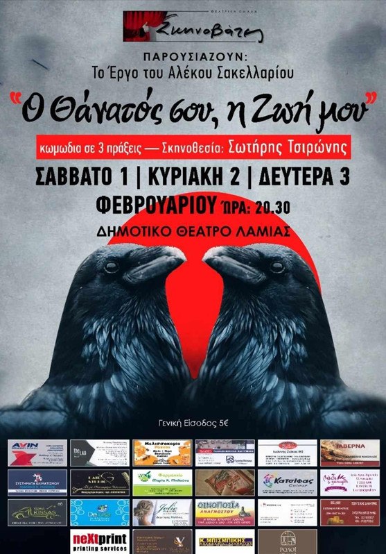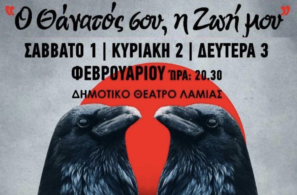 Η ερασιτεχνική θεατρική ομάδα "ΣΚΗΝΟΒΑΤΕΣ", παρουσιάζει την παράσταση “Ο Θάνατός σου, η ζωή μου” στις: 01/02 Σάββατο, 02/02 Κυριακή και 03/02 Δευτέρα, στο Δημοτικό Θέατρο Λαμίας.