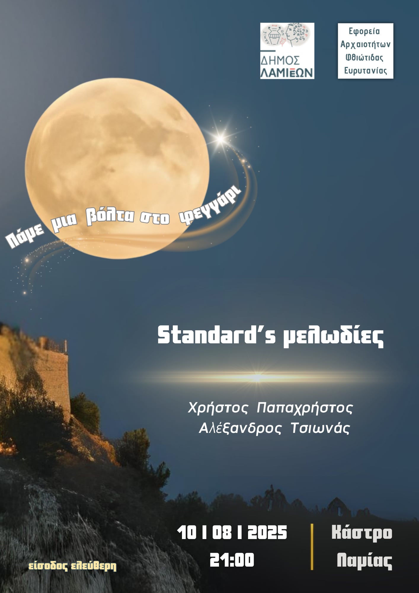 - Την Κυριακή 10 Αυγούστου στις 21:00, στο Κάστρο της Λαμίας «Standard’s μελωδίες» με ήχους κιθάρας, σαξοφώνου και τις φωνές του Χρήστου Παπαχρήστου και του Αλέξανδρου Τσιωνά.
