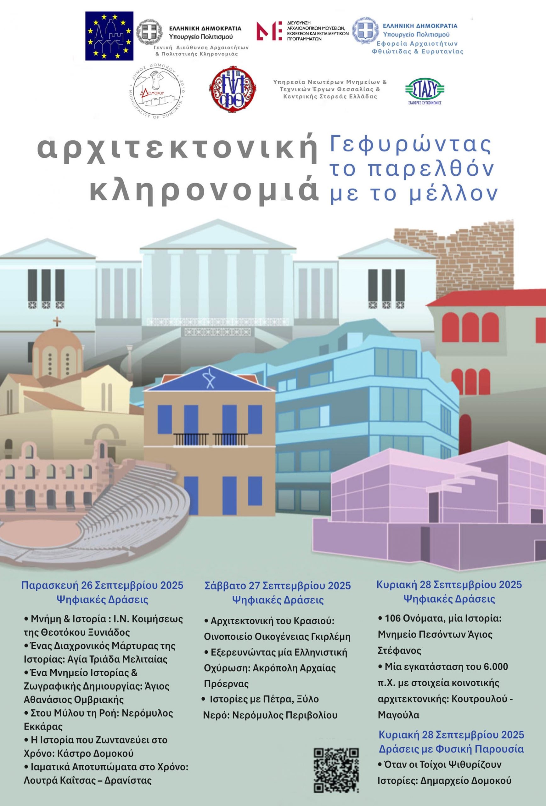 Ο φετινός εορτασμός των «Ευρωπαϊκών Ημερών Πολιτιστικής Κληρονομιάς» θα διαρκέσει από 26 έως 28 Σεπτεμβρίου 2025. Το κοινό θέμα εορτασμού στις ευρωπαϊκές χώρες έχει τίτλο “Architectural Heritage: Windows to the Past, Doors to the Future” - «Αρχιτεκτονική Κληρονομιά - Γεφυρώνοντας το παρελθόν με το μέλλον». Η παραπάνω δράση αποσκοπεί στην ανάδειξη του σημαντικού ρόλου που διαδραματίζουν τόσο η ίδια η αρχιτεκτονική κληρονομιά, όσο και η άυλη πολιτιστική κληρονομιά που σχετίζεται με αυτή, στη διατήρηση της προσωπικής και συλλογικής μνήμης, καθώς και στη διαμόρφωση της πολιτιστικής ταυτότητας της Ευρώπης.