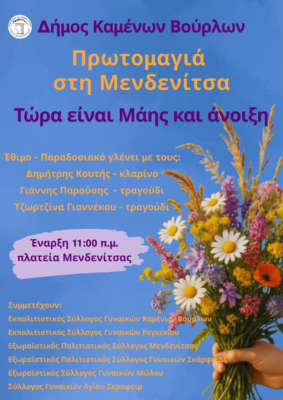 Ο Δήμος Καμένων Βούρλων έπειτα από πρωτοβουλία της Δημοτικής Κοινότητας Μενδενίτσας διοργανώνει την 1η Μαΐου στις 11 το πρωί στην πλατεία της Μενδενίτσας δρώμενο με τίτλο « Πρωτομαγιά στη Μενδενίτσα ».