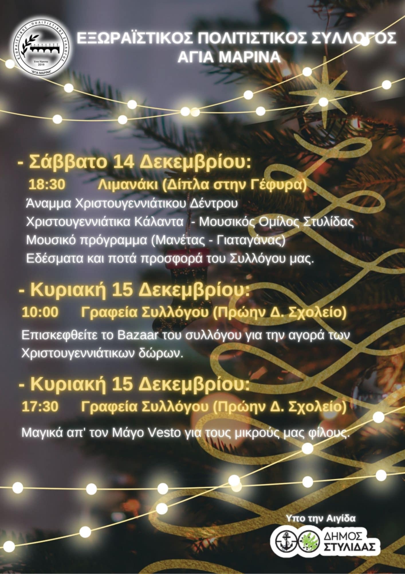 Ο Εξωραϊστικός Πολιτιστικός Σύλλογος «Αγία Μαρίνα» διοργανώνει μια σειρά από χριστουγεννιάτικες εκδηλώσεις για το Σαββατοκύριακο.
