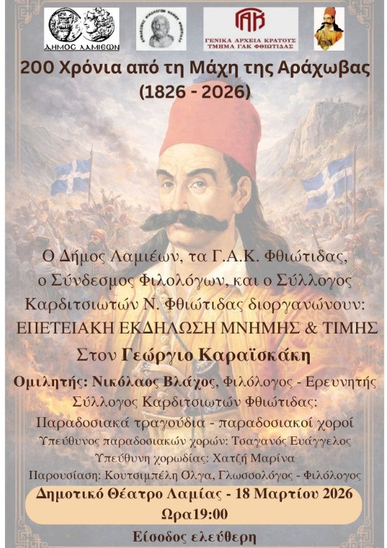 Ο Δήμος Λαμιέων, τα Γ.Α.Κ. Φθιώτιδας, ο Σύνδεσμος Φιλολόγων και ο Σύλλογος Καρδιτσιωτών Ν. Φθιώτιδας διοργανώνουν σήμερα το απόγευμα στις 7 στο Δημοτικό Θέατρο Λαμίας επετειακή εκδήλωση μνήμης και τιμής στον Γεώργιο Καραϊσκάκη.