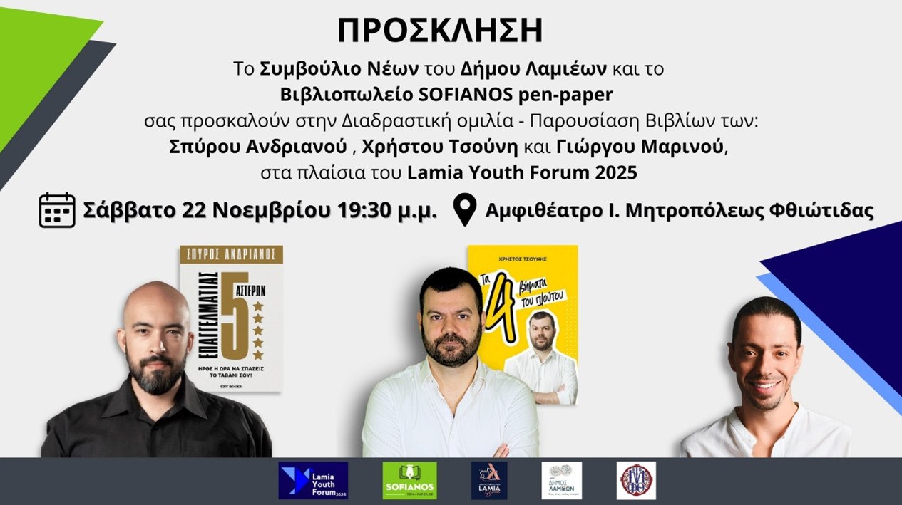 Το Συμβούλιο Νέων Δήμου Λαμιέων και το Βιβλιοπωλείο SOFIANOS pen-paper.gr με μεγάλη τιμή και χαρά, υποδέχονται τους Χρήστο Τσούνη, Σπύρο