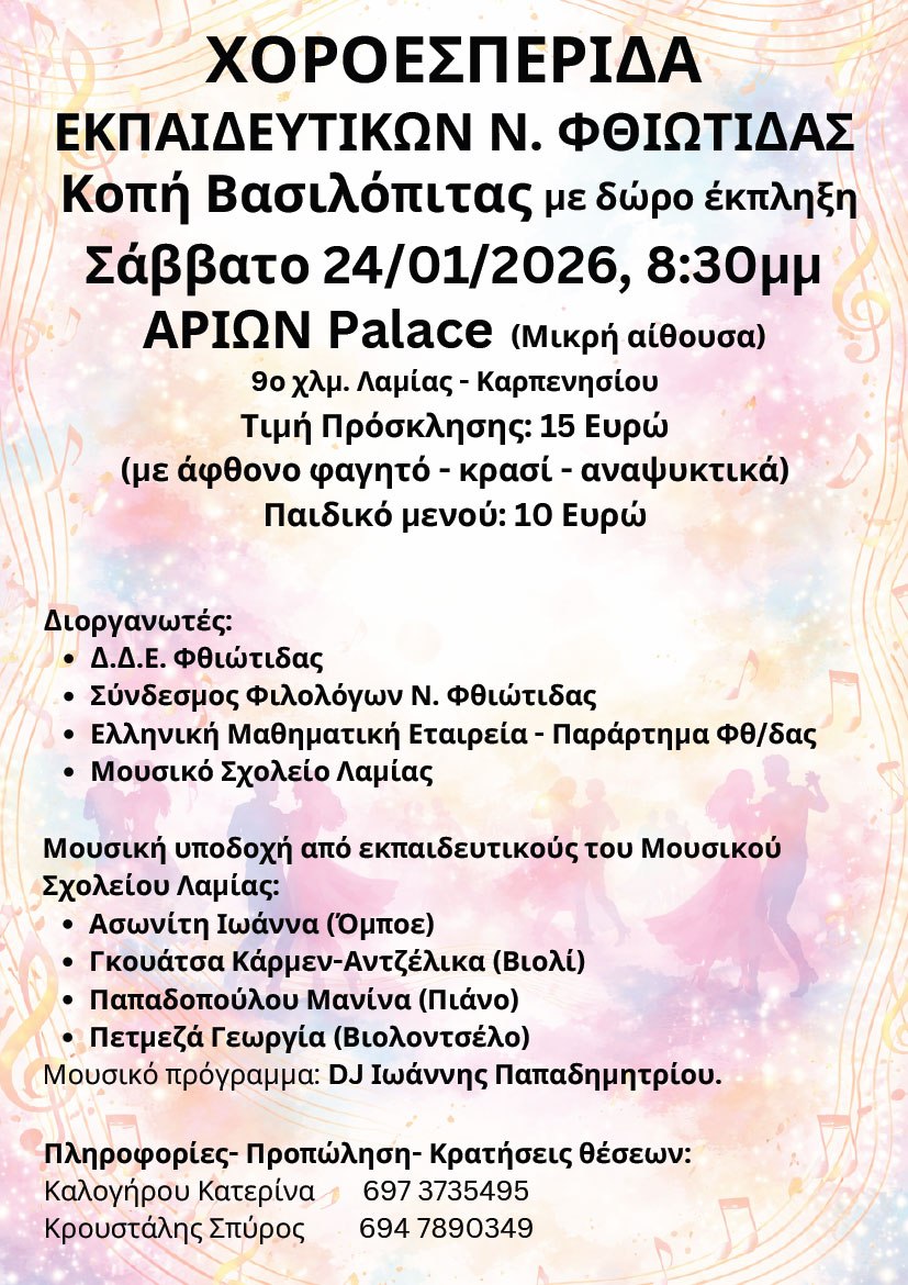 Την ετήσια χοροεσπερίδα τους διοργανώνουν σήμερα Σάββατο 24 Ιανουαρίου 2026, η Διεύθυνση Δευτεροβάθμιας Εκπαίδευσης Φθιώτιδας, ο Σύνδεσμος Φιλολόγων Φθιώτιδας και η Ελληνική Μαθηματική Εταιρία - Παράρτημα Φθιώτιδας και το Μουσικό Σχολείο Λαμίας.